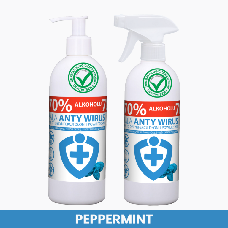 KALA ANTY WIRUS – płyn do dezynfekcji dłoni i powierzchni, który dba o Twoje zdrowie i skórę. Dzięki zawartości pantenolu łagodzi podrażnienia i regeneruje naskórek. Produkt posiada pozwolenie biobójcze i został dermatologicznie przetestowany. Zapach PEPPERMINT. W opakowaniu 500 ml wybierz wygodny dla siebie dozownik: atomizer lub pompka.