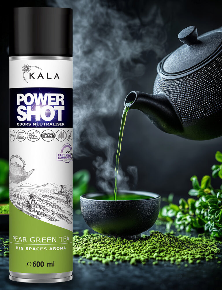 Neutralizator nieprzyjemnych zapachów, aromatyzer, odświeżacz Kala POWER SHOT zapach pear green tea 600 ml to spokojny, oryginalny zapach liści zielonej herbaty urozmaicony nutą owocu dojrzałej gruszki. Delikatny aromat sprawi, że poczujesz się jak w luksusowej herbaciarni.