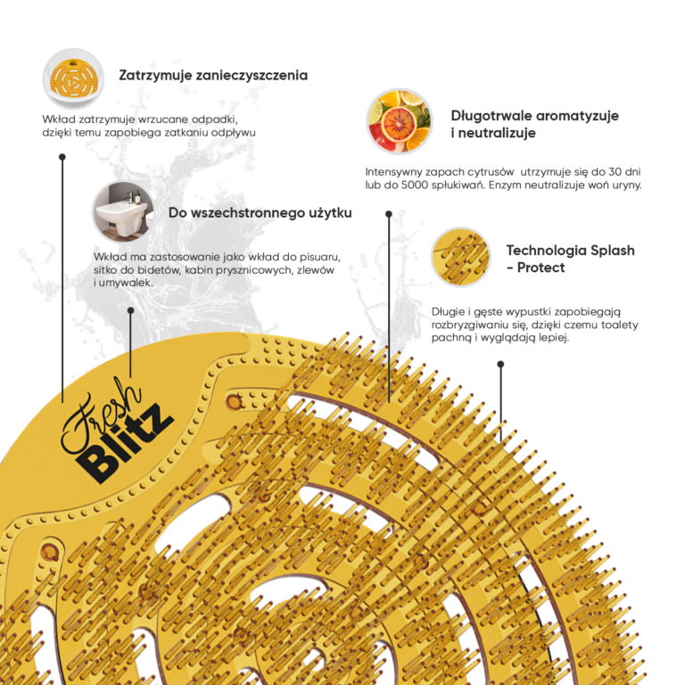 Nowa technologia SPLASH PROTECT zapobiega rozbryzgom cieczy: Dzięki wprowadzeniu technologii SPLASH PROTECT Fresh Blitz DISK 2.0 skutecznie ogranicza rozpryskiwanie się moczu. Splash Protect to technologia łącząca proces uszczelnienia włosia z unikalnym ułożeniem w kręgi.